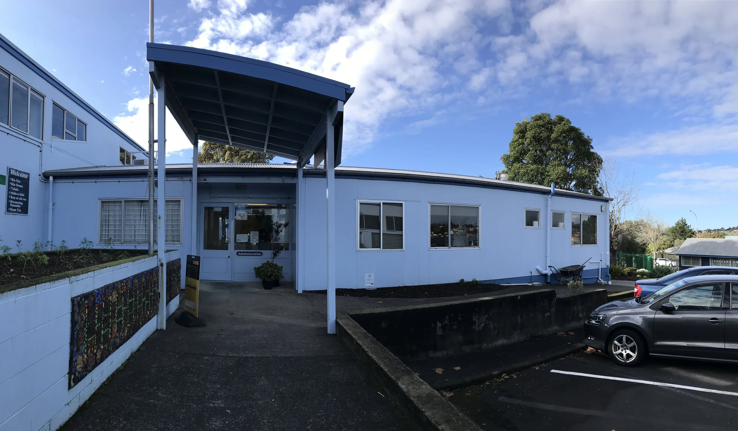 Lastly, by the school office, sits a gold bench seat. The curved gold bench links with the gold arch of the school logo and is symbolic of ‘bridging between the worlds of students and the community.’ Behind the gold bench stand four kauri trees. The four kauri are symbolic of Te Whare Tapa Whā (the four cornerstones of Māori health); taha whānau (family health), taha tinana (physical health), taha hinengaro (mental health) and taha wairua (spiritual health).
